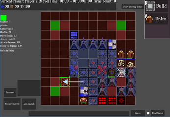 On the start you will be in offline mode, where you can test all mechanics playing for both opponents and having huge amount of res. First of all you should place the castle (main building) for both players (press B and then LMB at chosen cell), then you can start placing various buildings (B) and units (V).